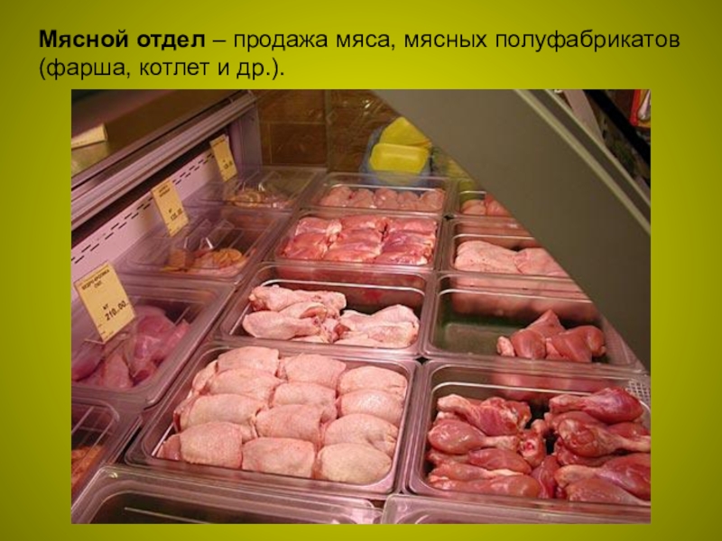 Мясной отдел – продажа мяса, мясных полуфабрикатов (фарша, котлет и др.).