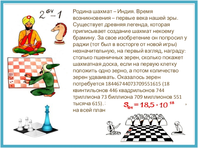 Существует древняя легенда, которая приписывает создание шахмат некоему брамину. За свое изобретение он попросил у раджи (тот был в восторге от новой игры) незначительную, на первый взгляд, награду: столько пшеничных зерен, сколько покажет шахматная доска, если на первую клетку положить одно зерно, а потом количество зерен удваивать. Оказалось зерен потребуется 18446744073709551615 (18 квинтильонов 446 квадрильонов 744 триллиона 73 биллиона 709 миллионов 551 тысяча 615). Этого количества не могло быть на всей планете.