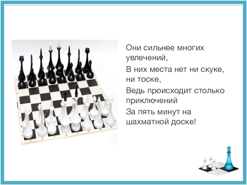 Они сильнее многих увлечений,В них места нет ни скуке, ни тоске,Ведь происходит столько приключенийЗа пять минут на шахматной доске!
