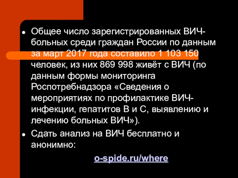 Слайд 14Общее число зарегистрированных ВИЧ-больных среди граждан России по данным за март