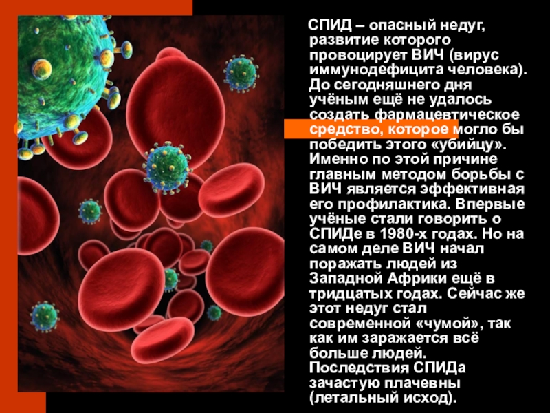 (вирус иммунодефицита человека). До сегодняшнего дня учёным ещё не удалось создать фармацевтическое средство, которое могло бы победить этого «убийцу». Именно по этой причине главным методом борьбы с ВИЧ является эффективная его профилактика. Впервые учёные стали говорить о СПИДе в 1980-х годах. Но на самом деле ВИЧ начал поражать людей из Западной Африки ещё в тридцатых годах. Сейчас же этот недуг стал современной «чумой», так как им заражается всё больше людей. Последствия СПИДа зачастую плачевны (летальный исход).