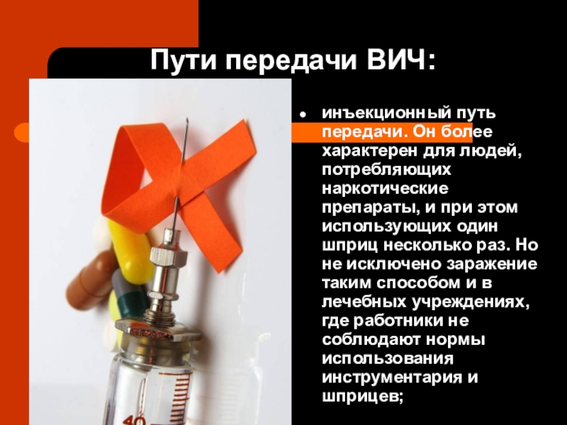 наркотические препараты, и при этом использующих один шприц несколько раз. Но не исключено заражение таким способом и в лечебных учреждениях, где работники не соблюдают нормы использования инструментария и шприцев;
