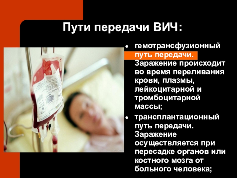 гемотрансфузионный путь передачи. Заражение происходит во время переливания крови,