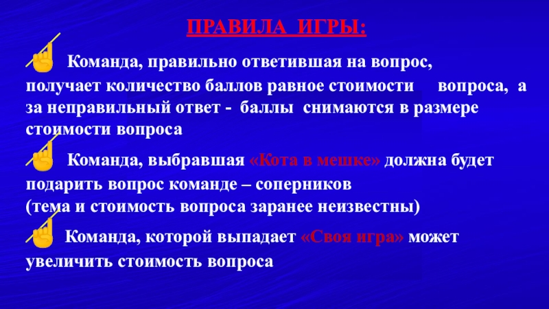 При правильном ответе баллы засчитываются, при неправильном снимаются с общего счета команды.