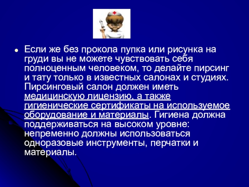 можете чувствовать себя полноценным человеком, то делайте пирсинг и тату только в известных салонах и студиях. Пирсинговый салон должен иметь медицинскую лицензию, а также гигиенические сертификаты на используемое оборудование и материалы. Гигиена должна поддерживаться на высоком уровне: непременно должны использоваться одноразовые инструменты, перчатки и материалы.