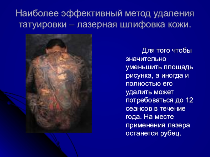 Слайд 6Наиболее эффективный метод удаления татуировки – лазерная шлифовка кожи.
