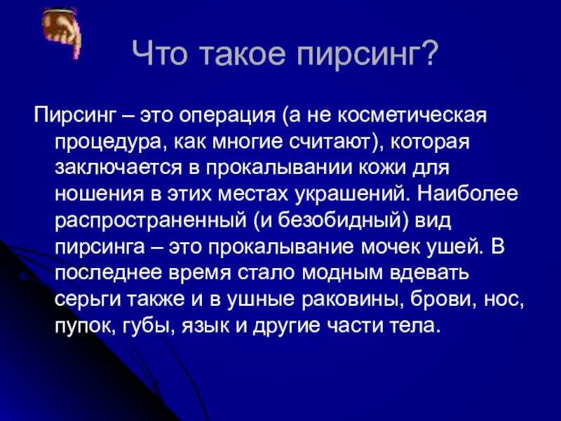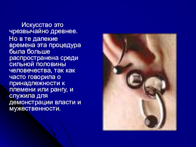 многие считают), которая заключается в прокалывании кожи для ношения в этих местах украшений. Наиболее распространенный (и безобидный) вид пирсинга – это прокалывание мочек ушей. В последнее время стало модным вдевать серьги также и в ушные раковины, брови, нос, пупок, губы, язык и другие части тела.