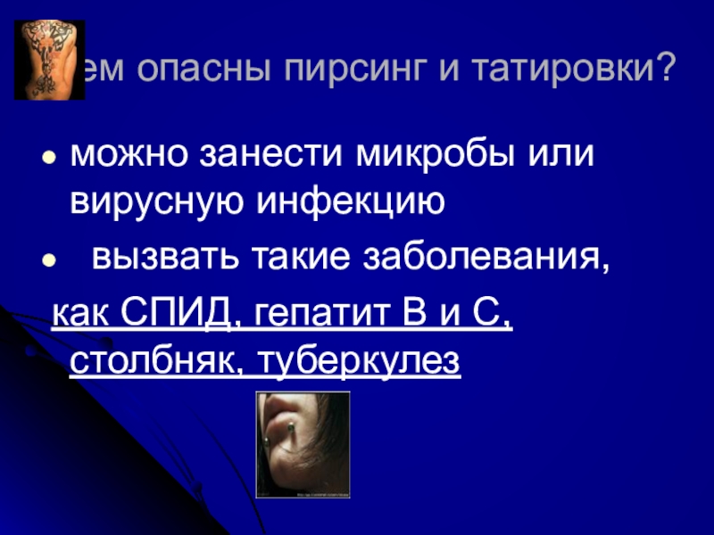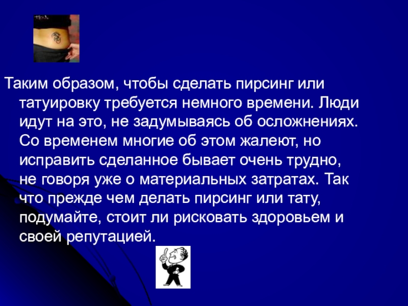 идут на это, не задумываясь об осложнениях. Со временем многие об этом жалеют, но исправить сделанное бывает очень трудно, не говоря уже о материальных затратах. Так что прежде чем делать пирсинг или тату, подумайте, стоит ли рисковать здоровьем и своей репутацией.