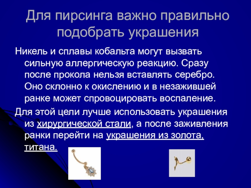 Для этой цели лучше использовать украшения из хирургической стали, а после заживления ранки перейти на украшения из золота, титана.