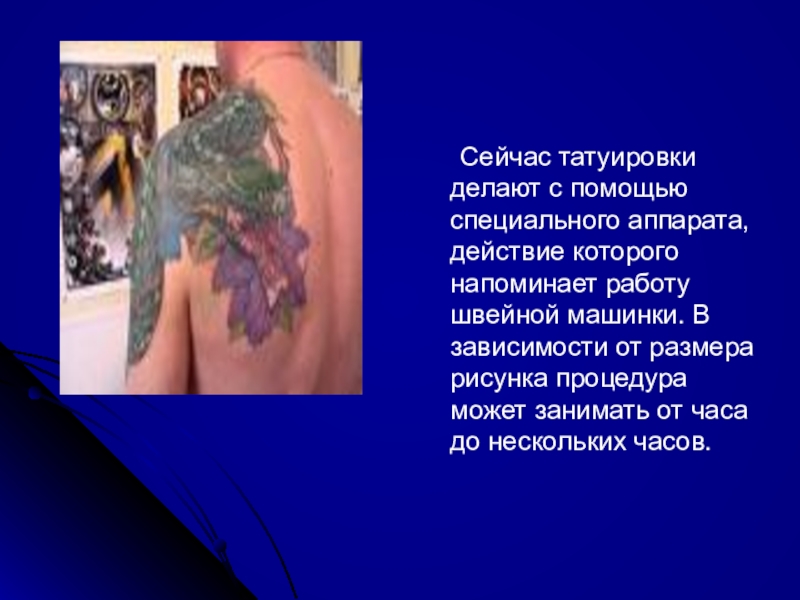Слайд 4 Сейчас татуировки делают с помощью специального аппарата, действие которого напоминает работу