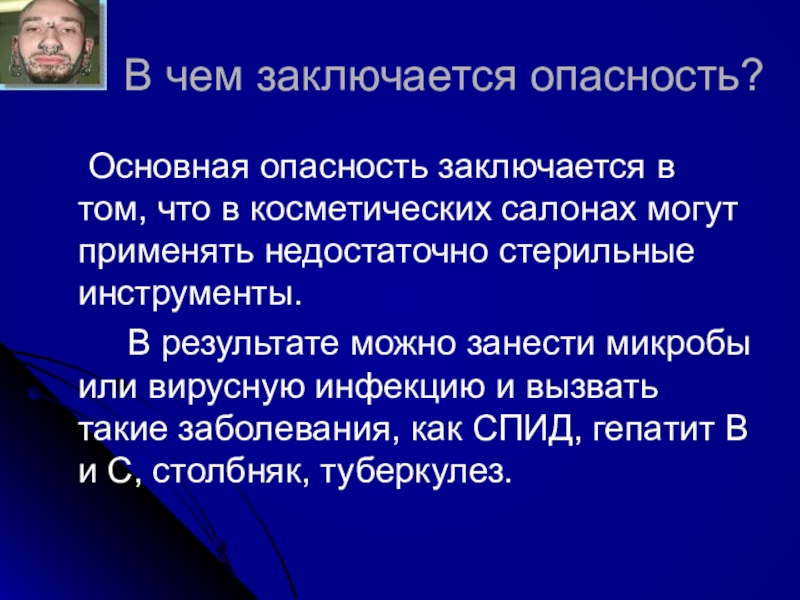 В результате можно занести микробы или вирусную инфекцию и вызвать такие заболевания, как СПИД, гепатит В и С, столбняк, туберкулез.