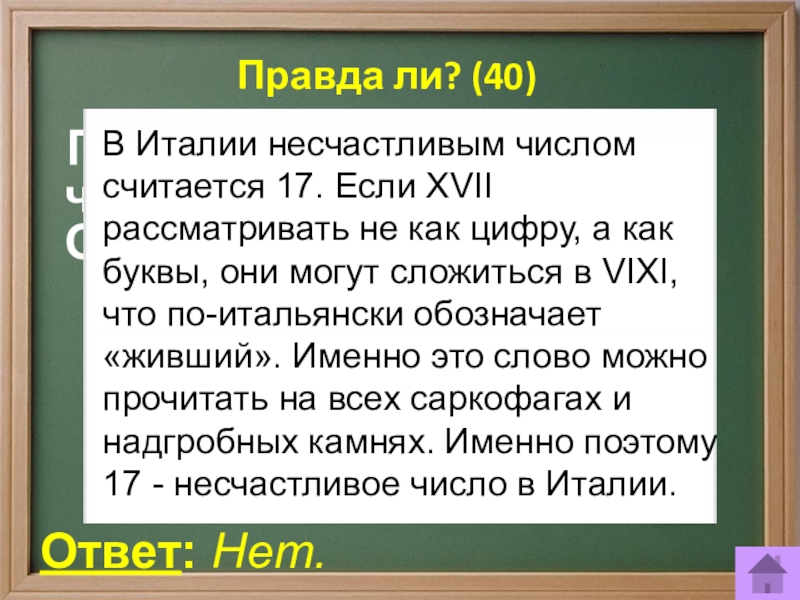В Италии несчастливым числом считается 17. Если XVII рассматривать не как цифру, а как буквы, они могут сложиться в VIXI, что по-итальянски обозначает «живший». Именно это слово можно прочитать на всех саркофагах и надгробных камнях. Именно поэтому 17 - несчастливое число в Италии.