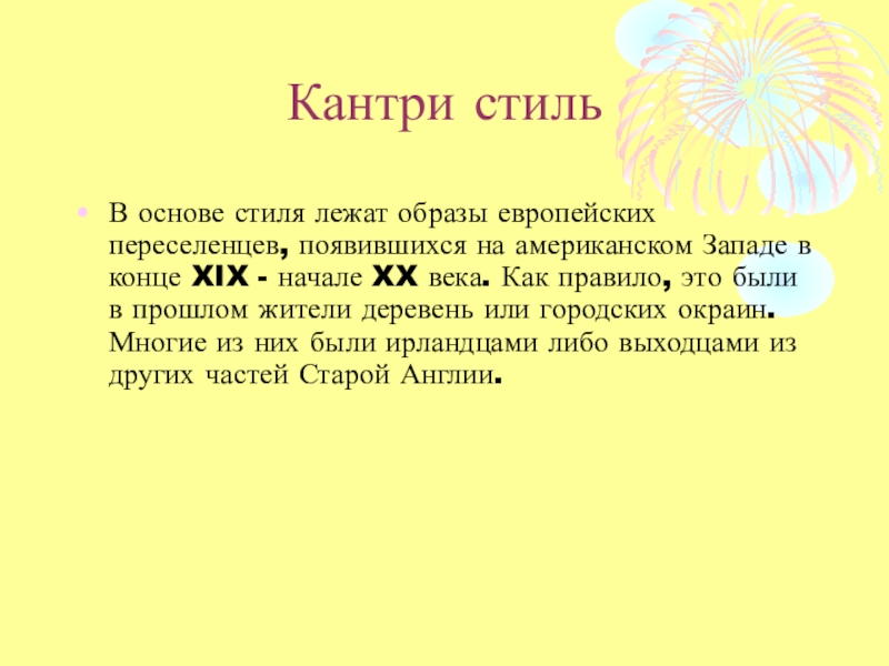 В основе стиля лежат образы европейских переселенцев, появившихся на американском