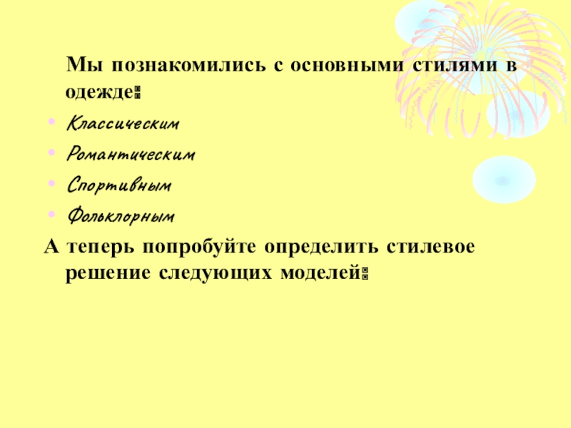 Слайд 20 Мы познакомились с основными стилями в одежде: