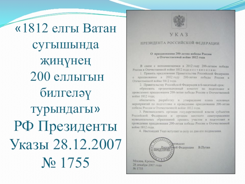 «1812 елгы Ватан сугышында җиңүнең   200 еллыгын билгеләү турындагы»  РФ Президенты Указы 28.12.2007 №