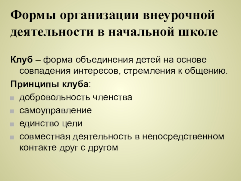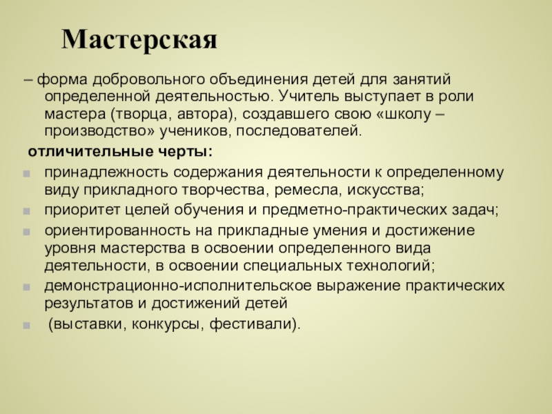 – форма добровольного объединения детей для занятий определенной деятельностью. Учитель выступает