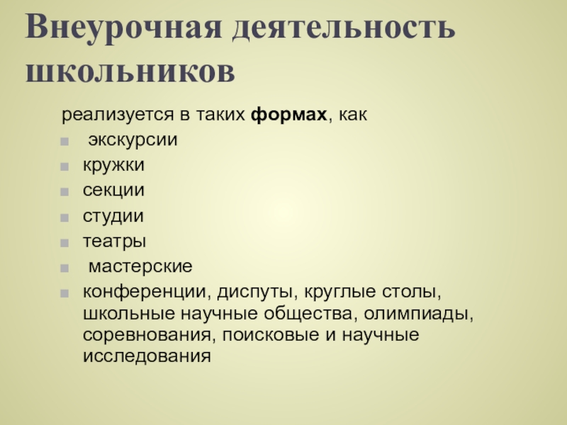 конференции, диспуты, круглые столы, школьные научные общества, олимпиады, соревнования, поисковые и научные исследования