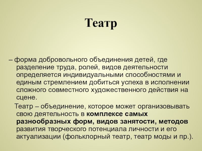 Театр – объединение, которое может организовывать свою деятельность в комплексе самых разнообразных форм, видов занятости, методов развития творческого потенциала личности и его актуализации (фольклорный театр, театр моды и пр.).