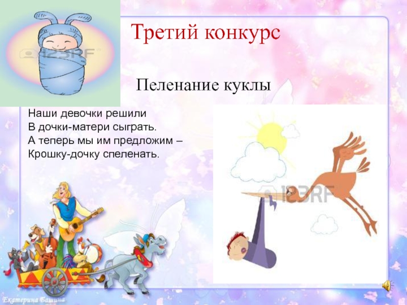 Третий конкурсПеленание куклыНаши девочки решили В дочки-матери сыграть. А теперь мы им предложим – Крошку-дочку спеленать.