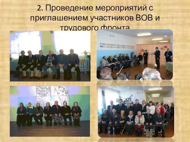 Слайд 112. Проведение мероприятий с приглашением участников ВОВ и трудового фронта