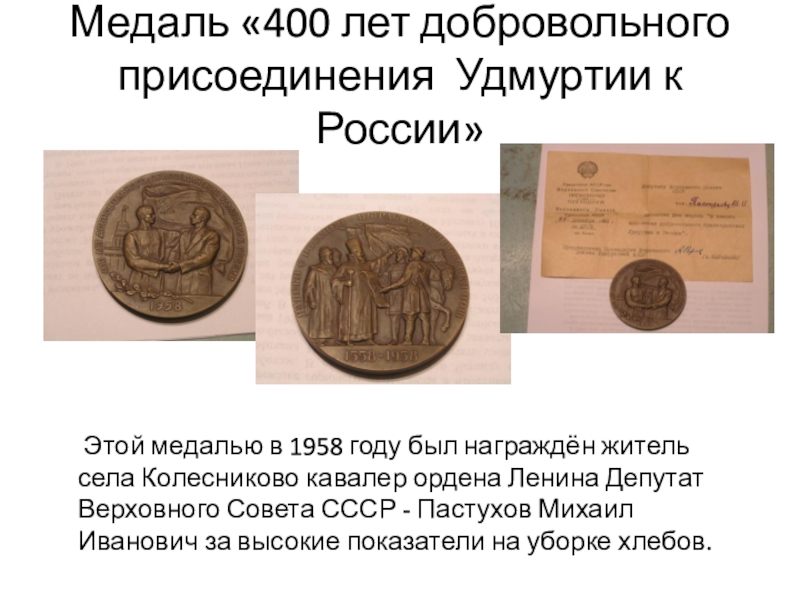 Слайд 19Медаль «400 лет добровольного присоединения Удмуртии к России»