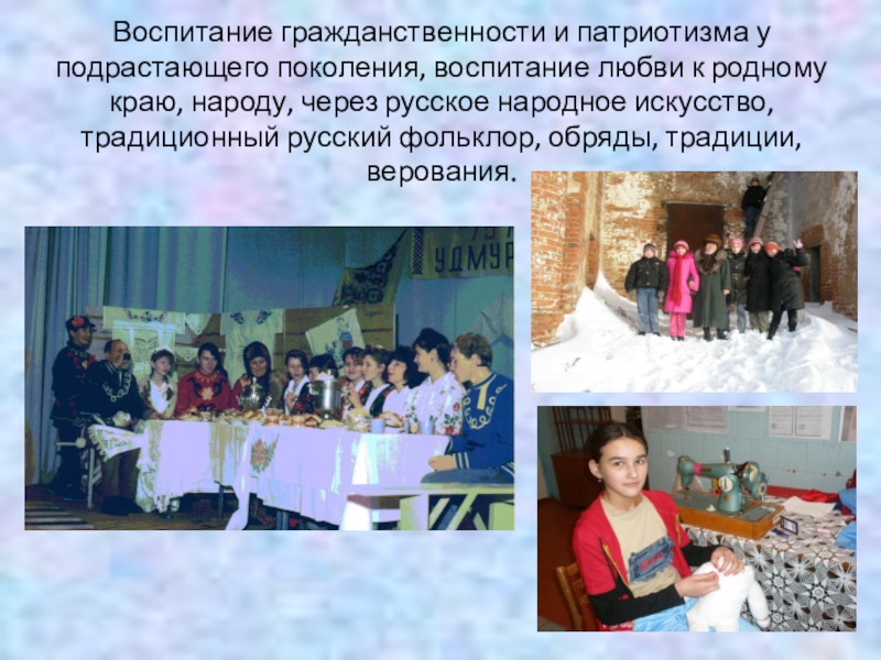 -воспитание гражданственности и патриотизма у подрастающего поколения, воспитание любви к родному краю, народу, через народное искусство, традиционный фольклор, обряды, традиции, верования.