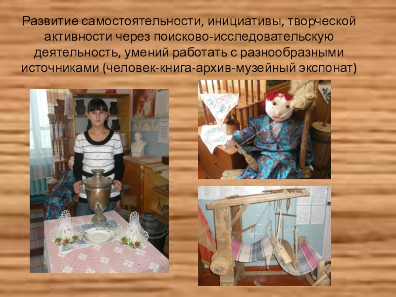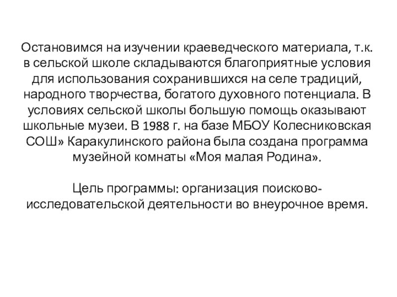 благоприятные условия для использования сохранившихся на селе традиций, народного творчества, богатого духовного потенциала. В условиях сельской школы большую помощь оказывают школьные музеи. В 1988 г. на базе МБОУ Колесниковская СОШ» Каракулинского района была создана программа музейной комнаты «Моя малая Родина».
