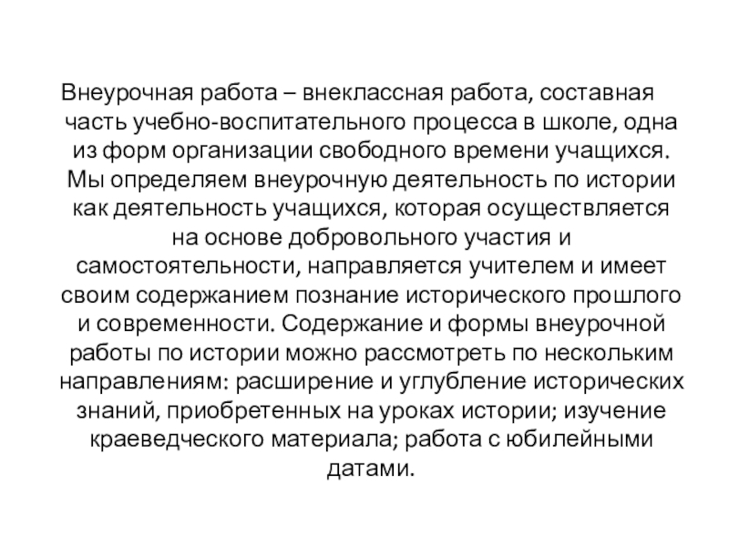 одна из форм организации свободного времени учащихся. Мы определяем внеурочную деятельность по истории как деятельность учащихся, которая осуществляется на основе добровольного участия и самостоятельности, направляется учителем и имеет своим содержанием познание исторического прошлого и современности. Содержание и формы внеурочной работы по истории можно рассмотреть по нескольким направлениям: расширение и углубление исторических знаний, приобретенных на уроках истории; изучение краеведческого материала; работа с юбилейными датами.