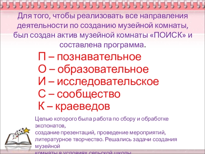 Слайд 14Для того, чтобы реализовать все направления деятельности по созданию музейной комнаты,