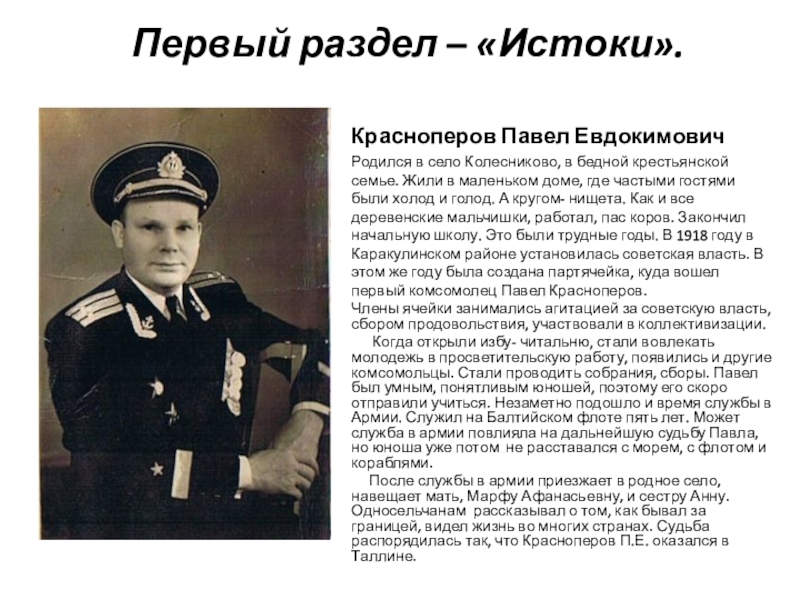 Когда открыли избу- читальню, стали вовлекать молодежь в просветительскую работу, появились и другие комсомольцы. Стали проводить собрания, сборы. Павел был умным, понятливым юношей, поэтому его скоро отправили учиться. Незаметно подошло и время службы в Армии. Служил на Балтийском флоте пять лет. Может служба в армии повлияла на дальнейшую судьбу Павла, но юноша уже потом не расставался с морем, с флотом и кораблями.