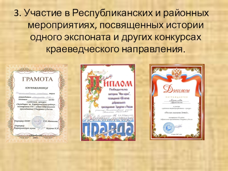 Слайд 123. Участие в Республиканских и районных мероприятиях, посвященных истории одного экспоната
