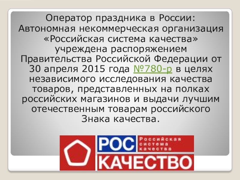 Правительства Российской Федерации от 30 апреля 2015 года №780-р в целях независимого исследования качества товаров, представленных на полках российских магазинов и выдачи лучшим отечественным товарам российского Знака качества.