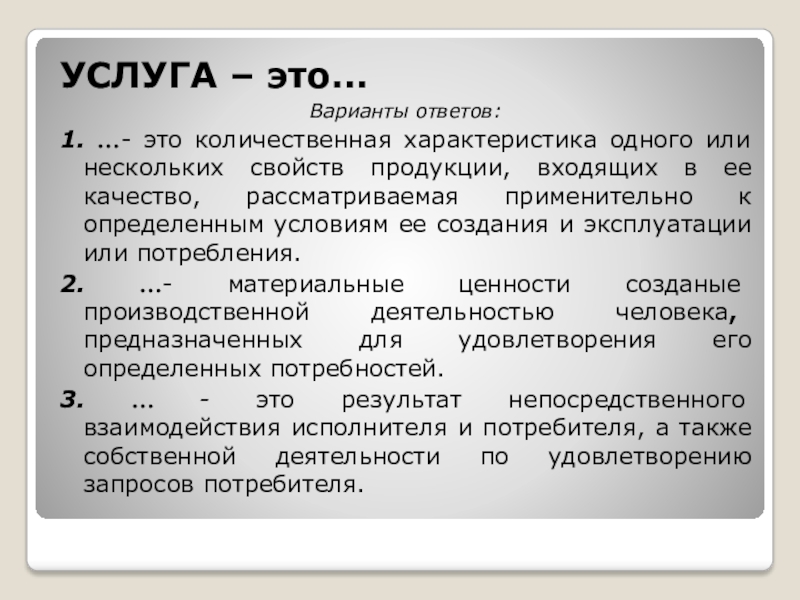 3. … - это результат непосредственного взаимодействия исполнителя и потребителя, а также собственной деятельности по удовлетворению запросов потребителя.