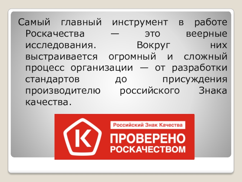 Слайд 14Самый главный инструмент в работе Роскачества — это веерные исследования. Вокруг