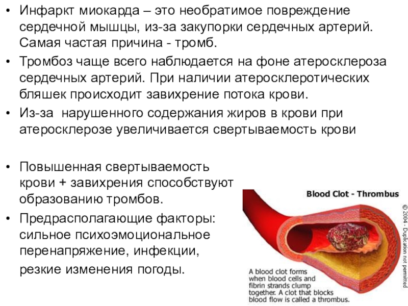 Повышенная свертываемость крови + завихрения способствуют образованию тромбов.