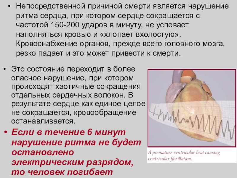 Если в течение 6 минут нарушение ритма не будет остановлено электрическим разрядом, то человек погибает