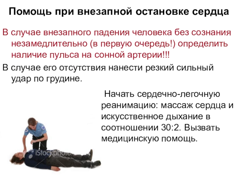 Начать сердечно-легочную реанимацию: массаж сердца и искусственное дыхание в соотношении 30:2. Вызвать медицинскую помощь.