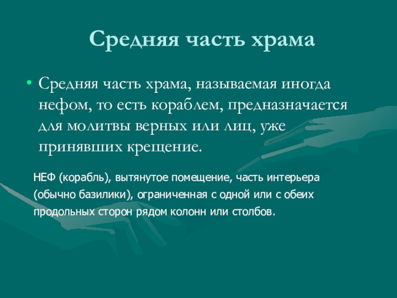 НЕФ (корабль), вытянутое помещение, часть интерьера (обычно базилики), ограниченная с одной или с обеих продольных сторон рядом колонн или столбов.