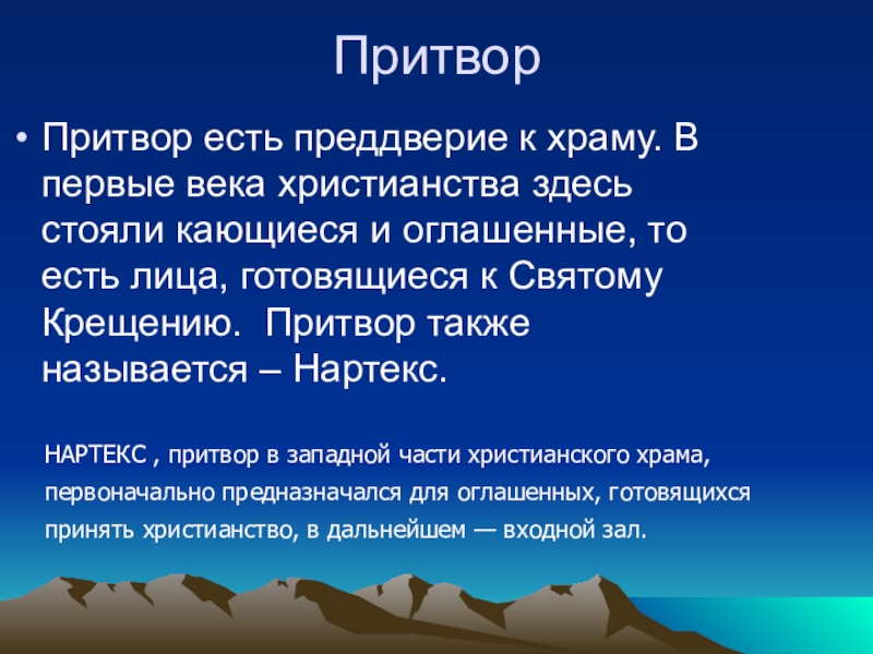 НАРТЕКС , притвор в западной части христианского храма, первоначально предназначался для оглашенных, готовящихся принять христианство, в дальнейшем — входной зал.
