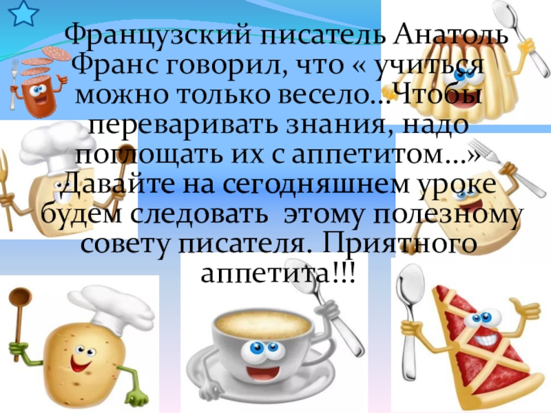переваривать знания, надо поглощать их с аппетитом…»Давайте на сегодняшнем уроке будем следовать этому полезному совету писателя. Приятного аппетита!!!