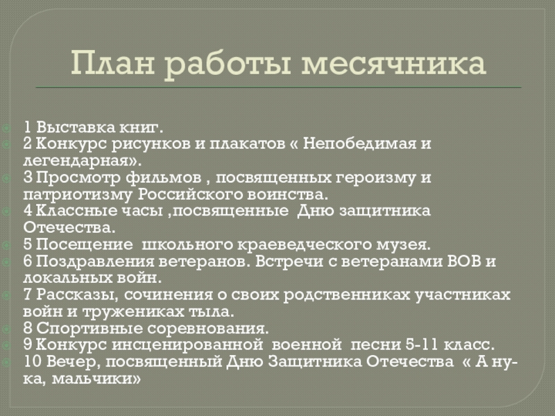 План работы месячника 1 Выставка книг. 2 Конкурс рисунков и плакатов « Непобедимая и легендарная».3 Просмотр фильмов