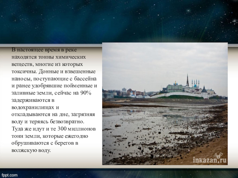 которых токсичны. Донные и взвешенные наносы, поступающие с бассейна и ранее удобрявшие пойменные и заливные земли, сейчас на 90% задерживаются в водохранилищах и откладываются на дне, загрязняя воду и теряясь безвозвратно. Туда же идут и те 300 миллионов тонн земли, которые ежегодно обрушиваются с берегов в волжскую воду.