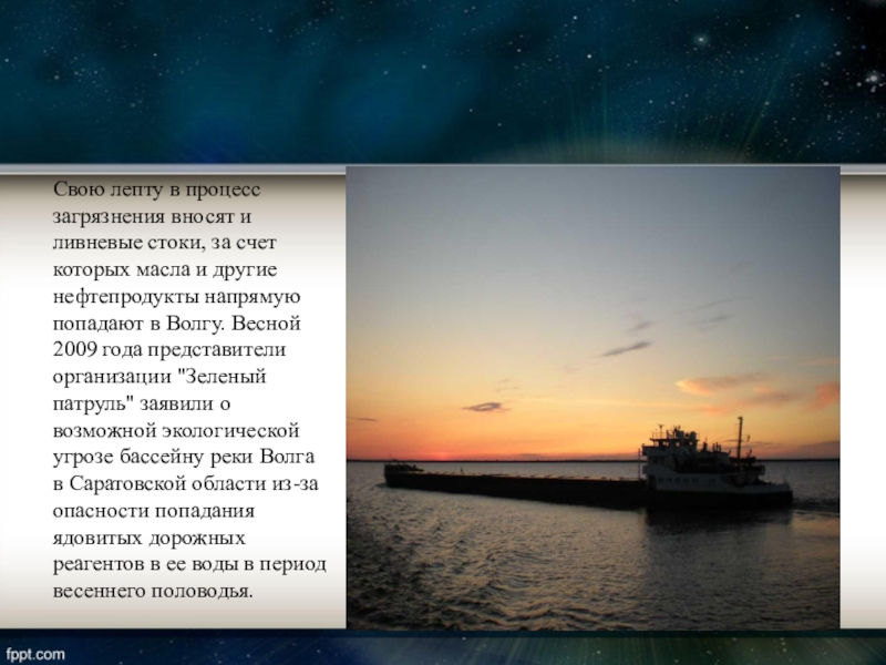 масла и другие нефтепродукты напрямую попадают в Волгу. Весной 2009 года представители организации "Зеленый патруль" заявили о возможной экологической угрозе бассейну реки Волга в Саратовской области из-за опасности попадания ядовитых дорожных реагентов в ее воды в период весеннего половодья.
