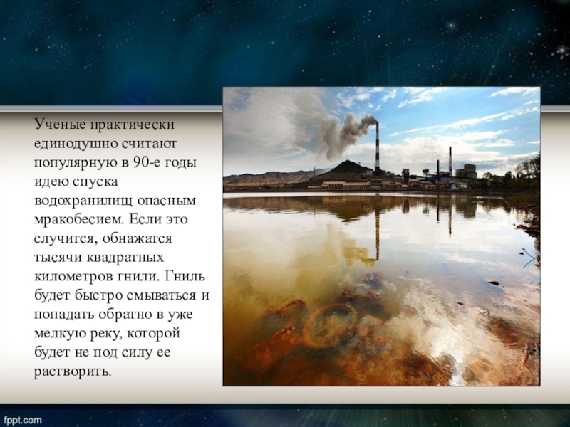 опасным мракобесием. Если это случится, обнажатся тысячи квадратных километров гнили. Гниль будет быстро смываться и попадать обратно в уже мелкую реку, которой будет не под силу ее растворить.