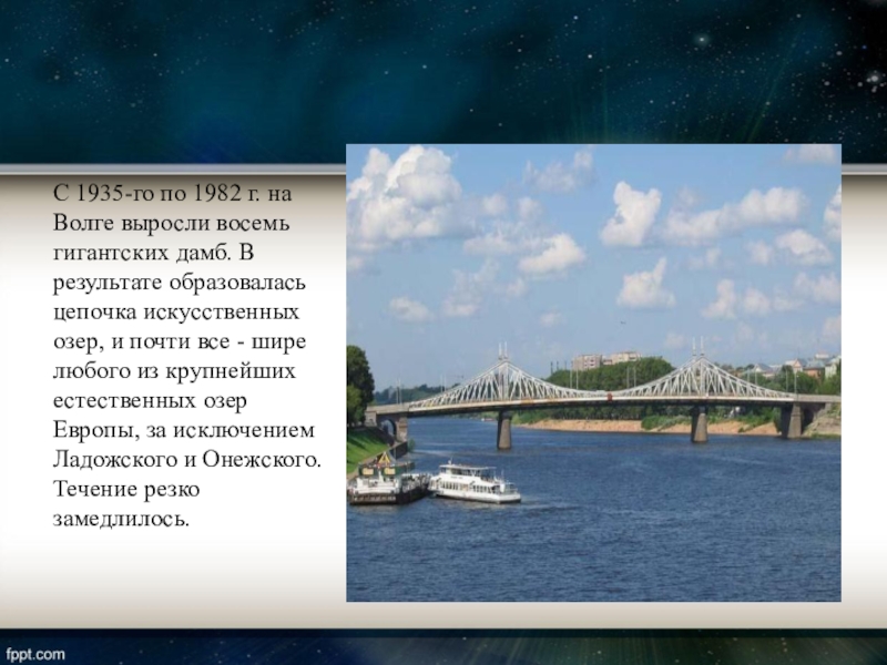 В результате образовалась цепочка искусственных озер, и почти все - шире любого из крупнейших естественных озер Европы, за исключением Ладожского и Онежского. Течение резко замедлилось.