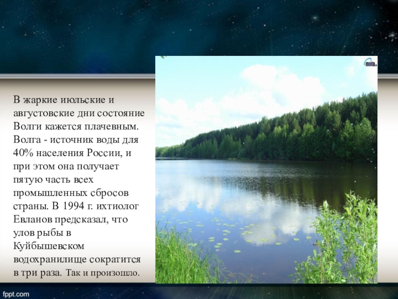 - источник воды для 40% населения России, и при этом она получает пятую часть всех промышленных сбросов страны. В 1994 г. ихтиолог Евланов предсказал, что улов рыбы в Куйбышевском водохранилище сократится в три раза. Так и произошло.
