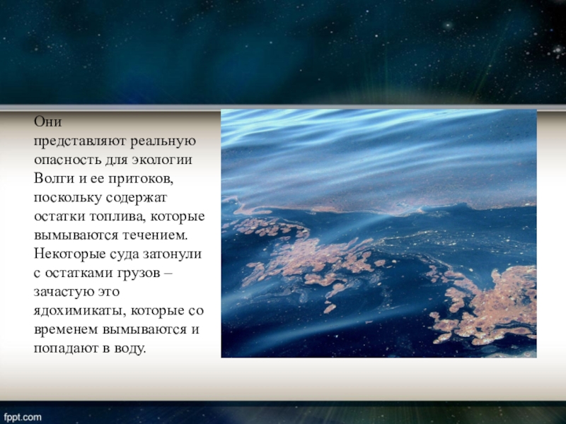 остатки топлива, которые вымываются течением. Некоторые суда затонули с остатками грузов – зачастую это ядохимикаты, которые со временем вымываются и попадают в воду.