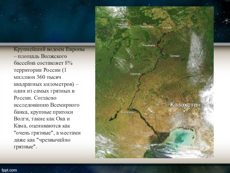 (1 миллион 360 тысяч квадратных километров) – один из самых грязных в России. Согласно исследованию Всемирного банка, крупные притоки Волги, такие как Ока и Кама, оцениваются как "очень грязные", а местами даже как "чрезвычайно грязные".