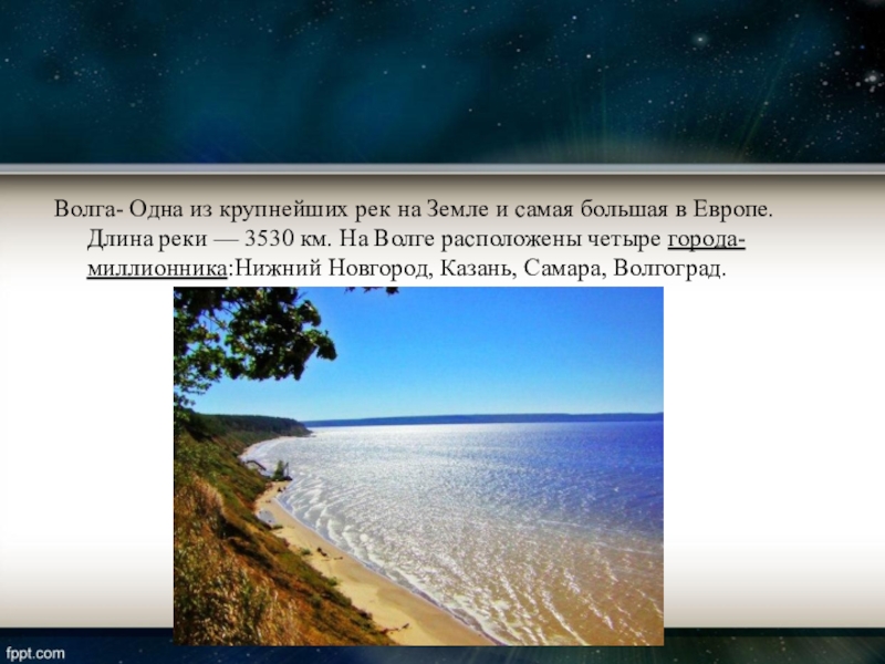 Волга- Одна из крупнейших рек на Земле и самая большая в Европе. Длина реки —