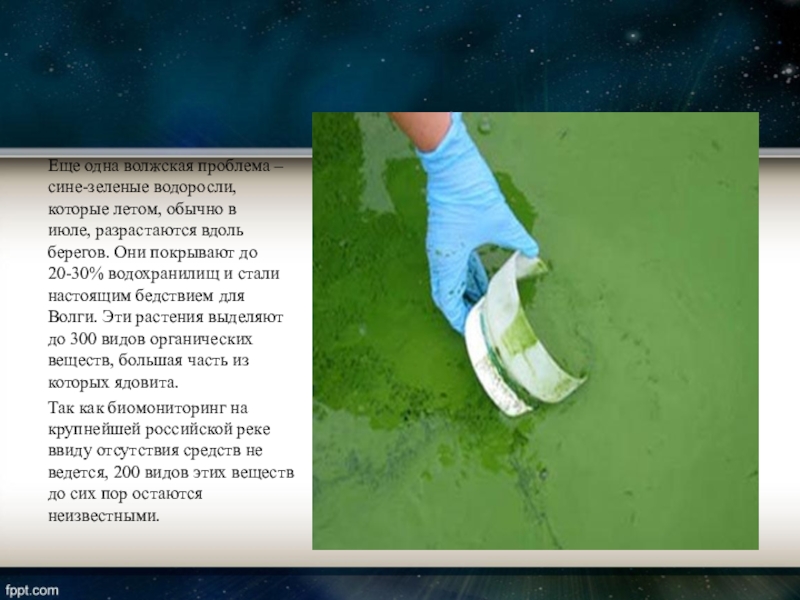 июле, разрастаются вдоль берегов. Они покрывают до 20-30% водохранилищ и стали настоящим бедствием для Волги. Эти растения выделяют до 300 видов органических веществ, большая часть из которых ядовита.
